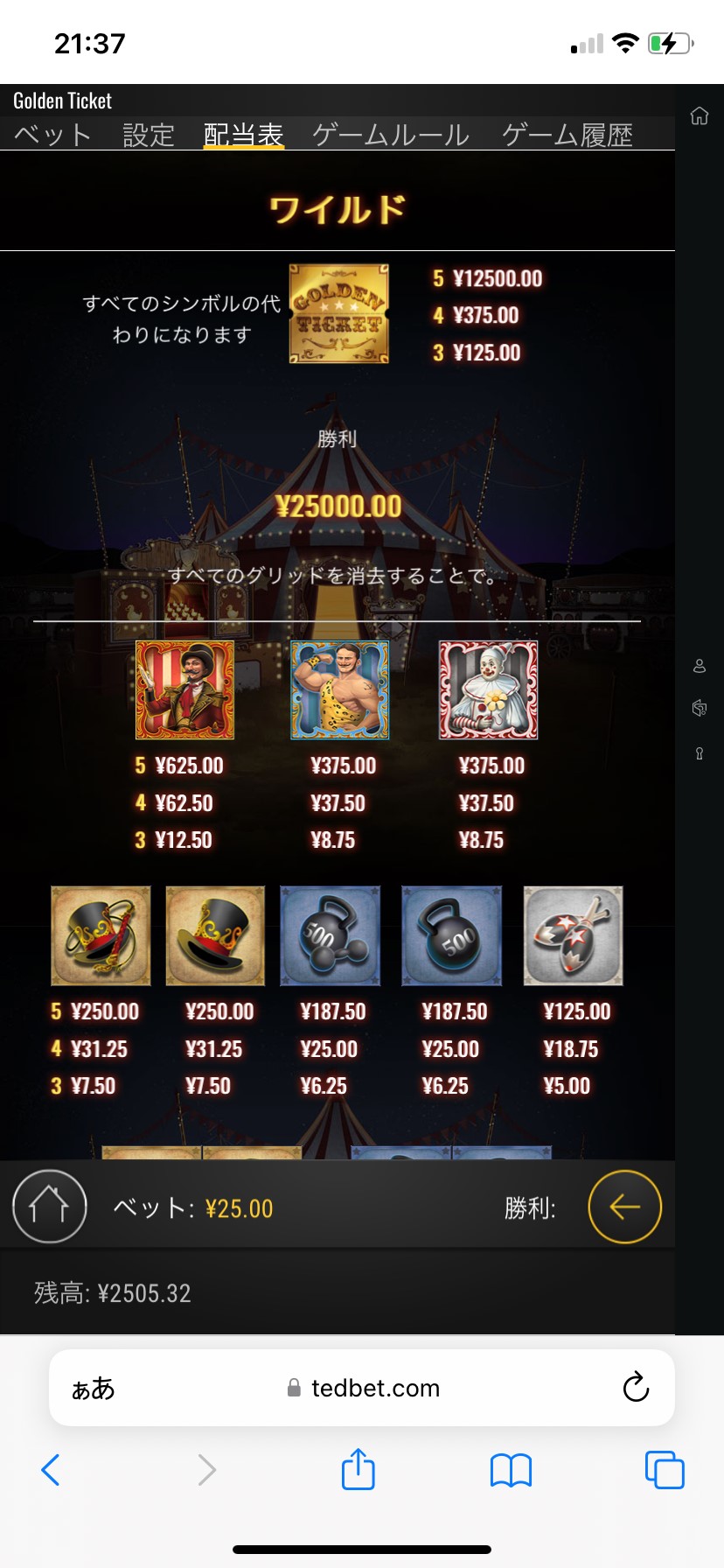ポイントとしては、3つでないとワイルドシンボル(GoldenTicket)に変換されない。